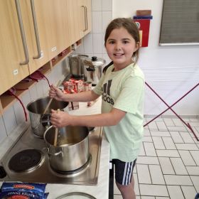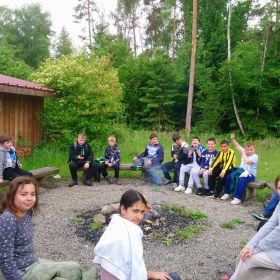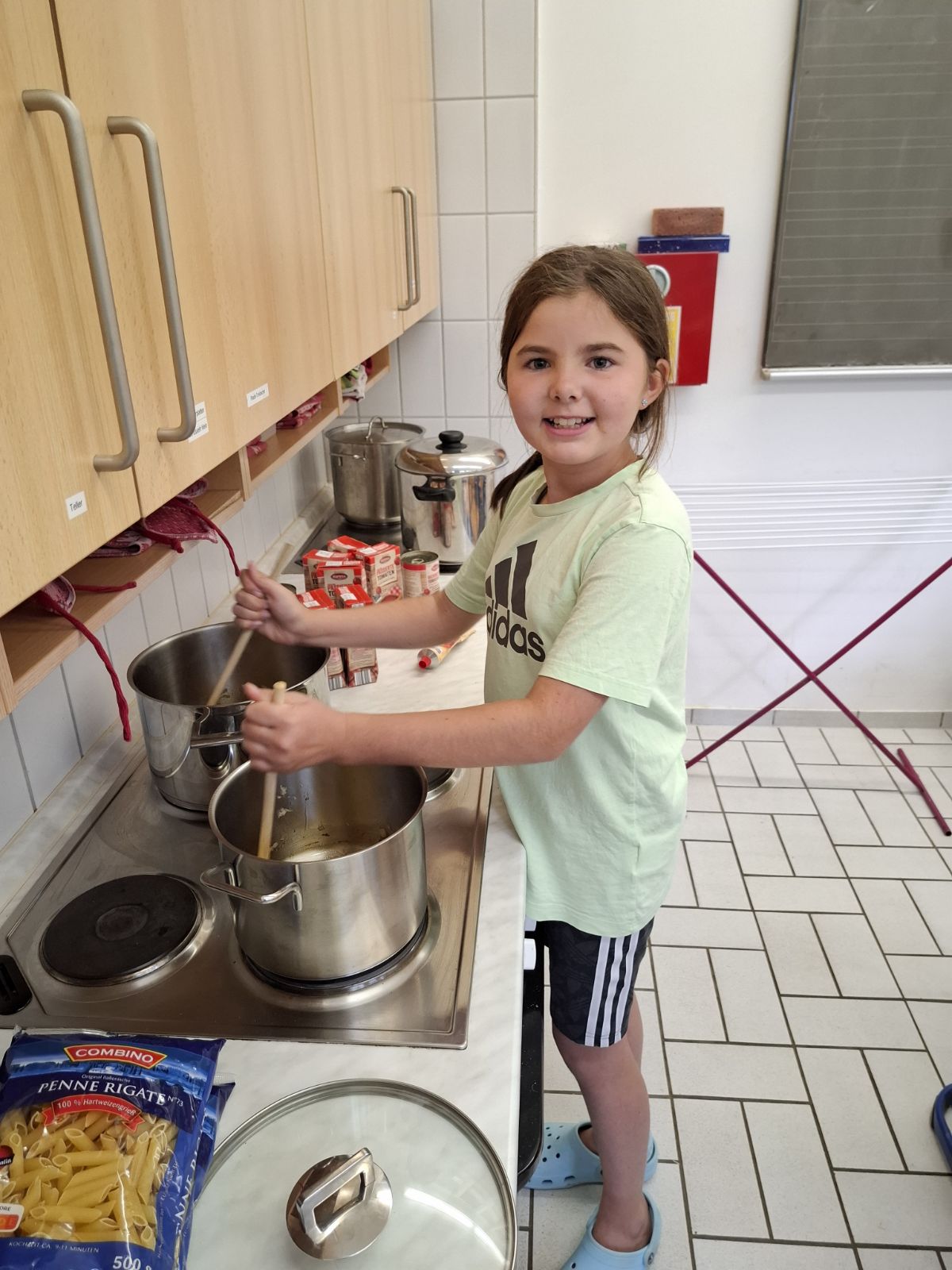 Gegen Nachmittag fuhren die Klassen wieder zurück zur Schule und richteten dort schon mal ihr Nachtlager in den Klassenzimmern ein. Während einige Kinder die darauffolgende Zeit mit Gesellschaftsspielen verbrachten, kochten andere zusammen mit den Lehrkräften für alle Nudeln und Bolognese-Soße. Nachdem alle Kinder satt und zufrieden waren, richteten sich die Schülerinnen und Schüler für die Nachtwanderung. Leider fiel diese nach wenigen Metern aufgrund von starkem Regen ins Wasser, sodass die Gruppe zurück in die Schule flüchten musste. Dort machten es sich alle in der Pausenhalle gemütlich, um den Abend mit einem Film ausklingen zu lassen. Später lagen die Kinder müde, aber glücklich, in ihren Schlafsäcken und erzählten sich gegenseitig Geschichten. Nach einiger Zeit kehrte dann in allen Zimmern Ruhe ein...