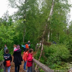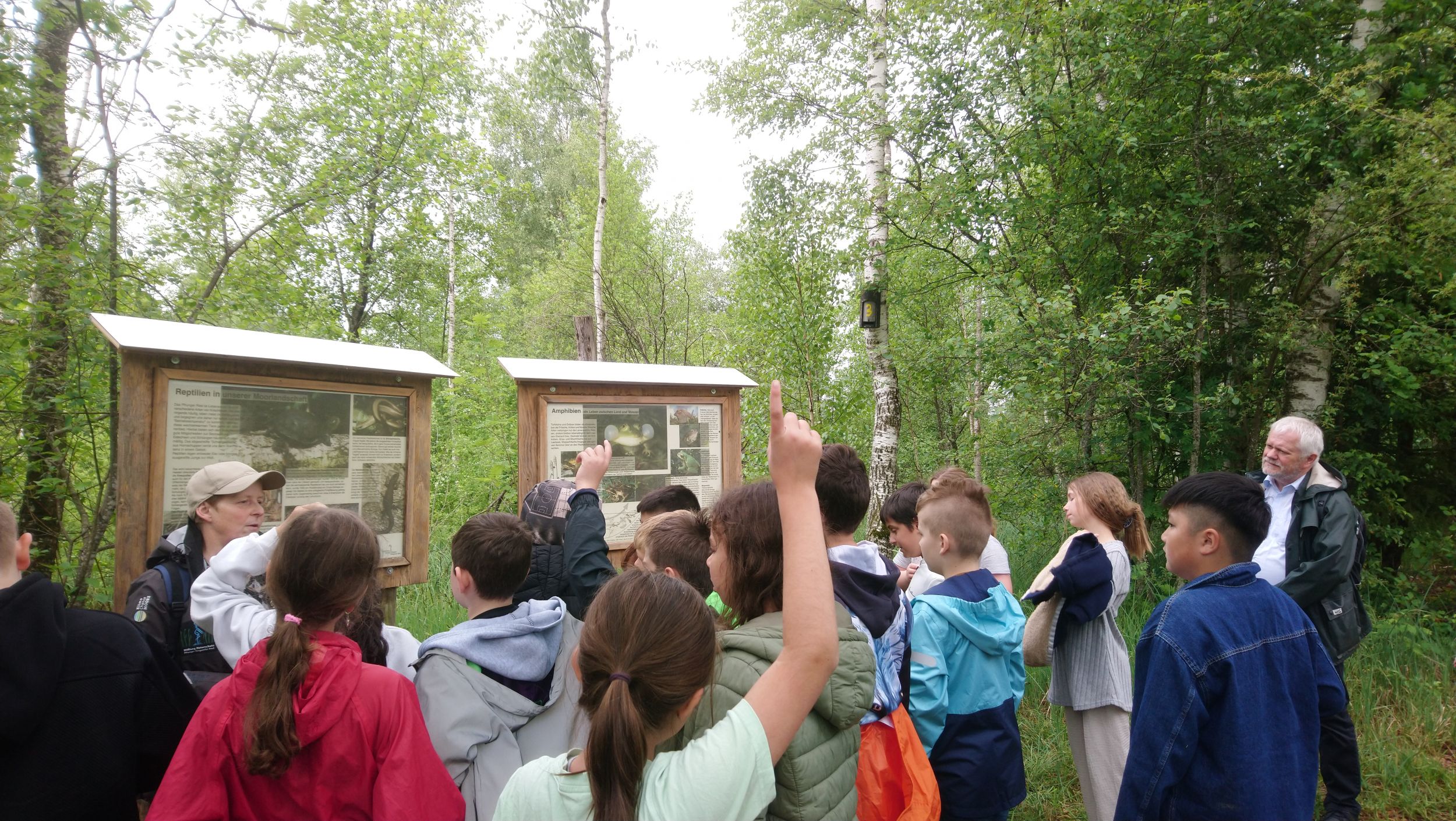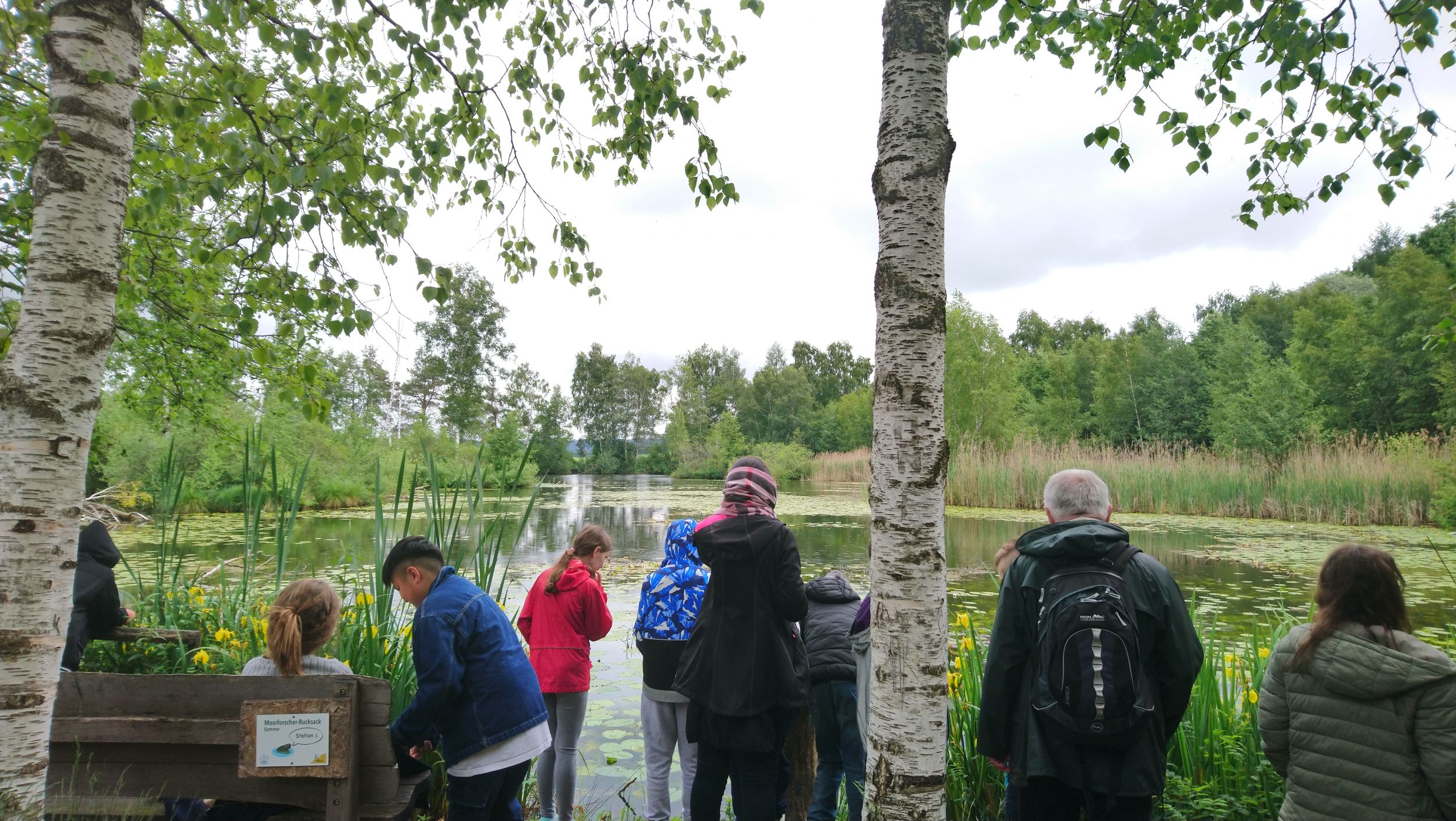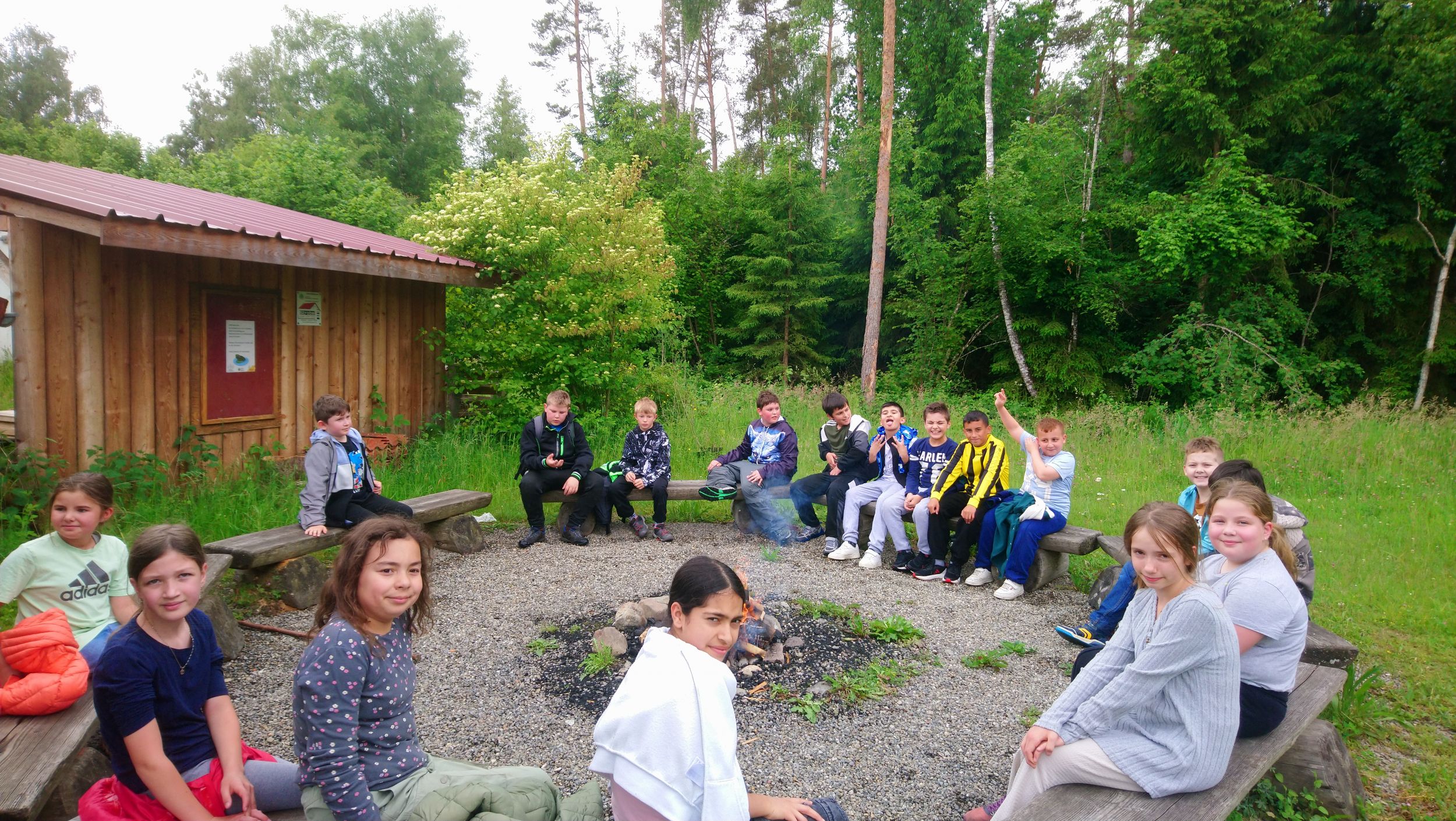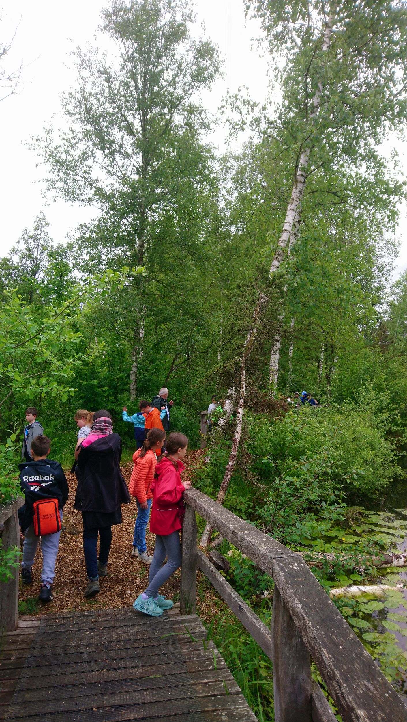 Nachdem morgens alle Kinder gut gelaunt und sehr aufgeregt ihr Gepäck in die Klassenzimmer geschleppt haben, ging es auch schon los. Die Klassen fuhren zum Naturschutzzentrum Wilhelmsdorf und wurden dort gleich von Frau Wagner in Empfang genommen. Nach einem Fühl-Spiel zu Beginn begann die Wanderung durch den Moor-Erlebnis-Pfad. Dabei konnten die Schülerinnen und Schüler zahlreiche spannende Entdeckungen machen und viele Fragen stellen. Besonders der "Wackelboden" des Moors faszinierte die Kinder. Trotz des regnerischen Wetters konnten viele Tiere beobachtet werden, unter anderem Libellen, ein Schwan, viele kleine Erdkröten-Babys und Frösche. Sogar die Sumpfschildkröten zeigten sich. Nach circa zwei Stunden war die Gruppe wieder zurück am Naturschutzzentrum und wurde dort mit einem Lagerfeuer überrascht. Die Kinder grillten, trotz einsetzendem Regen, munter ihre Würstchen und erkundeten im Anschluss den naheliegenden Spielplatz.