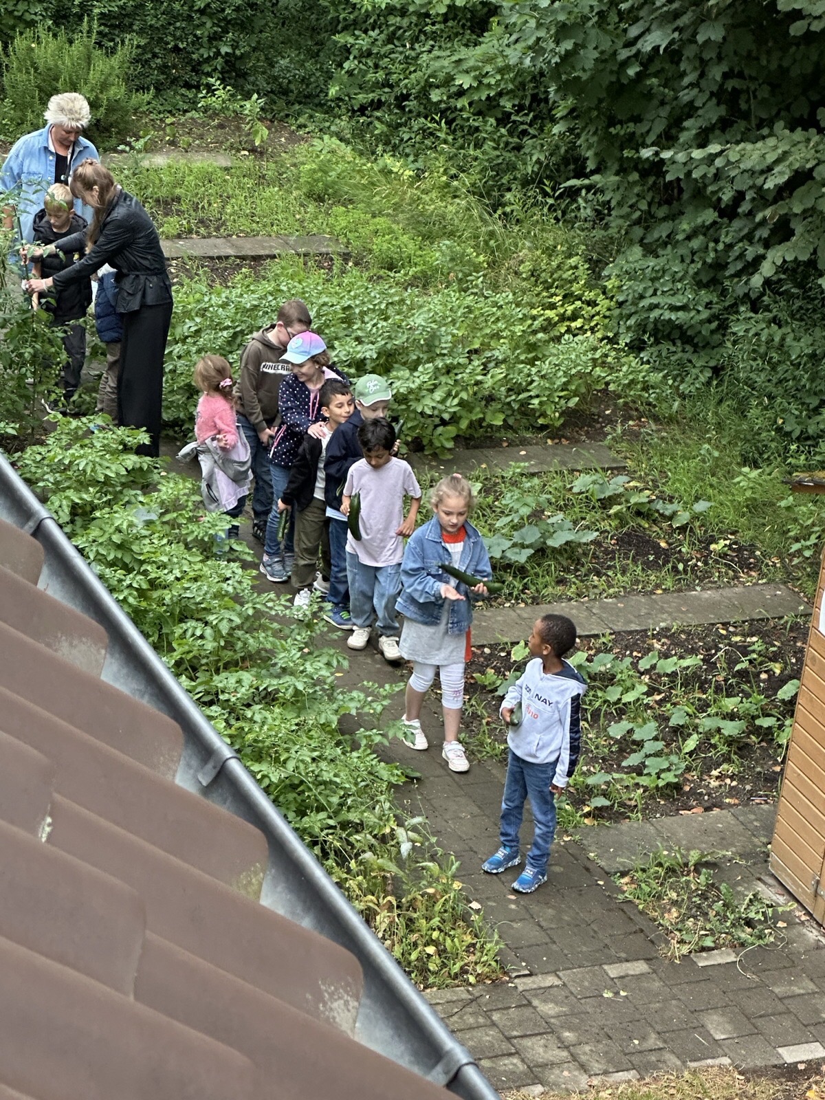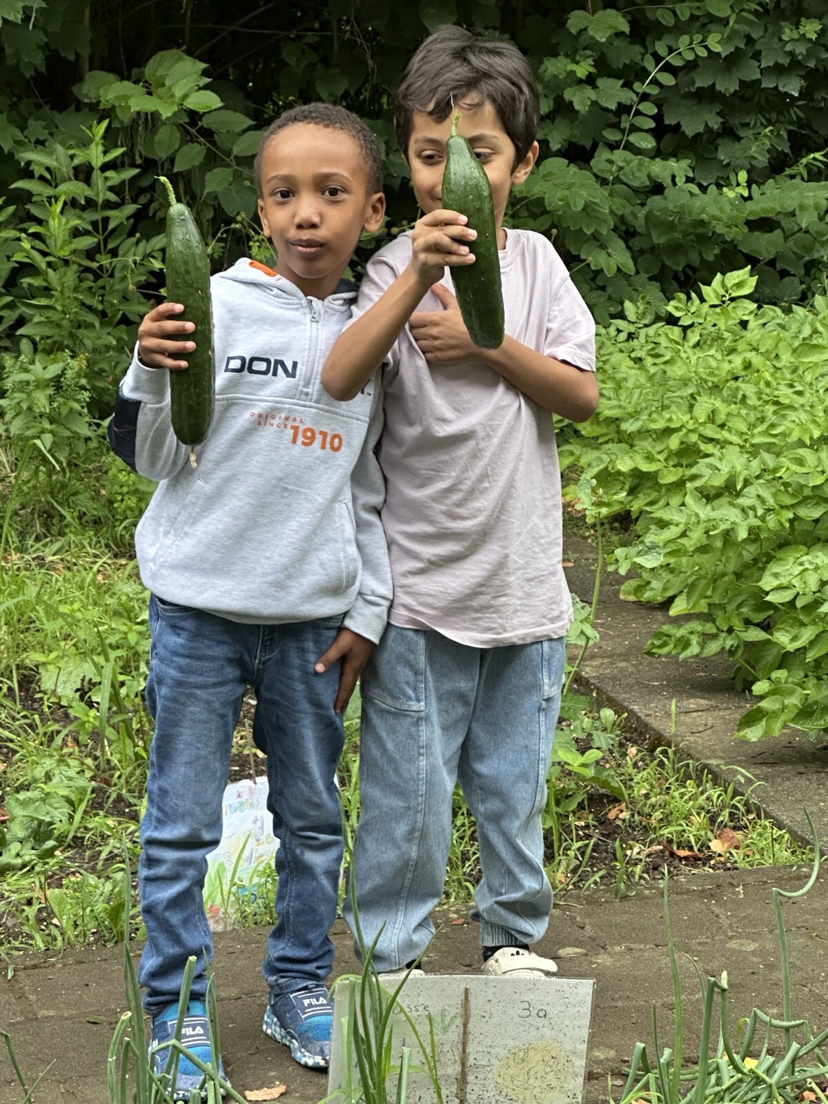 Im Schulgarten wächst und gedeiht es. In diesem Sommer haben die Kinder der Sonnenland-Schule eine reiche Ernte aus ihrem Schulgarten! Die ersten (scharfen) Radieschen wurden schon geerntet und zur Freude aller Lehrkräfte von den Kindern der 1f in einen leckeren Brotaufstrich verwandelt. Es wurden auch schon fast 20 köstliche große und kleine Gurken geerntet und natürlich sofort verspeist. Auch die Tomaten, Zwiebeln und Kartoffeln sehen schon gut aus; müssen aber leider noch etwas reifen. Und auch für die hungrigen Schnecken haben wir gesorgt: die haben sich über unsere Bohnen hergemacht!