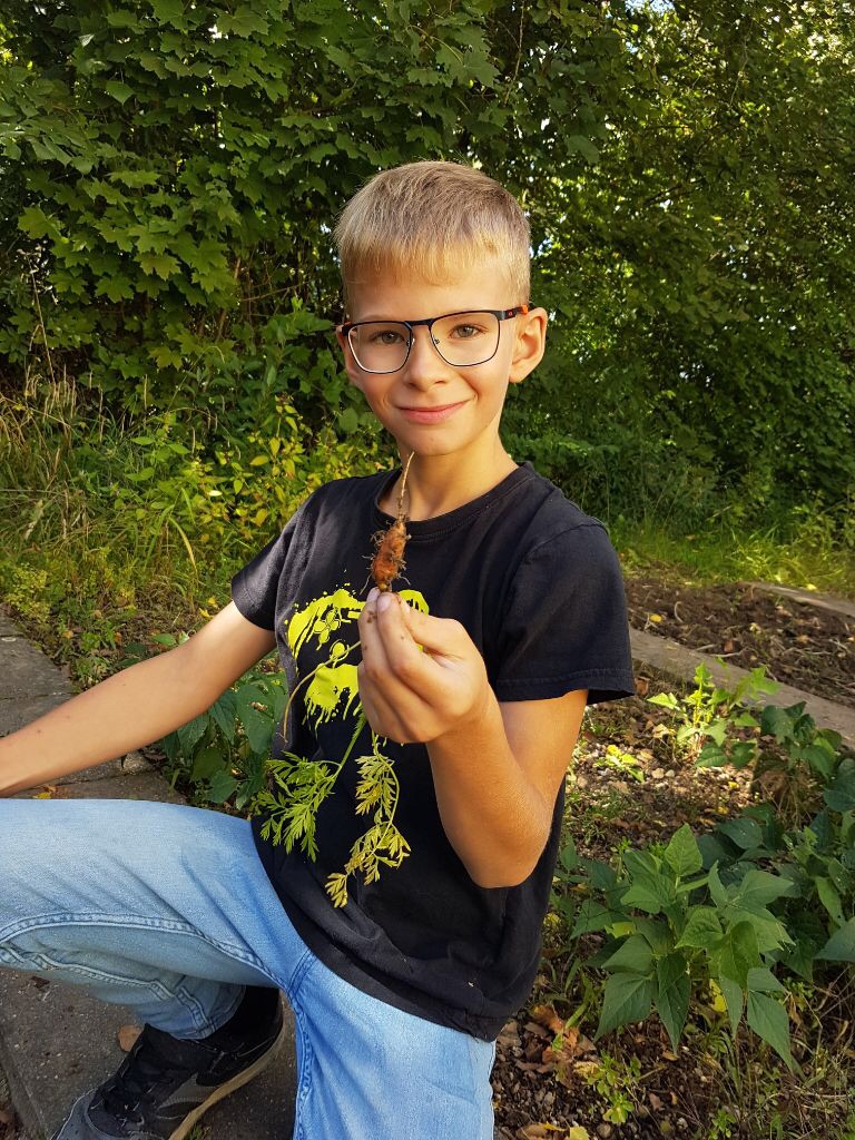 Die Kinder der 1F konnten in den ersten Schultagen des neuen Schuljahres im Schulgarten fleißig Möhren ernten. Über den Sommer mussten sie sich gedulden und warten bis die Möhren groß genug waren.