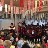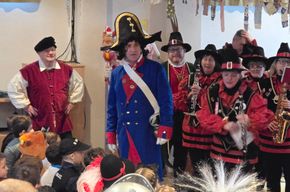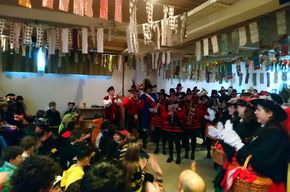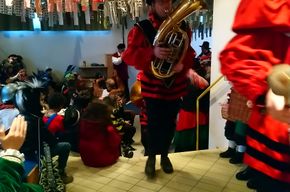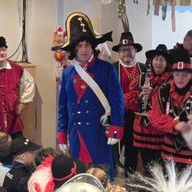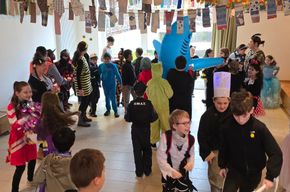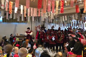 Nach der Polonaise durchs Schulhaus versammelten sich alle Kinder und Lehrkräfte in bunten Kostümen in der Pausenhalle der Schule. Die Stockacher Narren ließen nicht lange auf sich warten und brachten mit der Hans-Kuony-Kapelle, der Abordnung des Narrengerichts, den Hänsele, den Marketenderinnen, den Laufnarren und den Alt-Stockacherinnen Fasnachtsstimmung ins Haus.